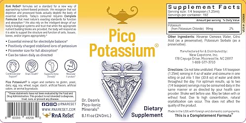 - "Pico Potassium is a highly absorbable liquid potassium supplement designed to support daily mineral intake and electrolyte balance throughout the body. Developed using the same proprietary stabilized ion technology as ReMag and ReMyte, this formula delivers potassium in a picometer-sized ionic form that is efficiently absorbed at the cellular level without digestive burden.* Each serving provides 99 milligrams of elemental potassium derived from potassium chloride. The precision of this formulation allows for controlled dosing to meet individual dietary needs and helps maintain healthy muscle function, nerve transmission, and fluid balance within cells.* Potassium is an essential mineral that works in concert with magnesium and sodium to regulate hydration, cardiovascular rhythm, and neuromuscular activity. Because modern diets often fall short of potassium-rich foods, a concentrated supplement like Pico Potassium offers a practical solution for maintaining optimal intake as part of a balanced routine.* This formula is unflavored, clear, and easy to mix with water or your preferred beverage. Each bottle is NSF Contents Certified, vegan, gluten free, and made without yeast, dairy, eggs, soy, wheat, sugar, starch, artificial flavors, artificial colors, preservatives, or animal byproducts. Pico Potassium is a convenient and clean option for those seeking to complement their daily mineral foundation with highly absorbable potassium in its most effective form.* * These statements have not been evaluated by the Food and Drug Administration. This product is not intended to diagnose, treat, cure, or prevent any disease."