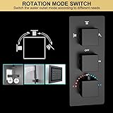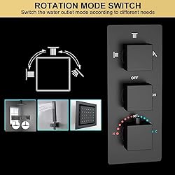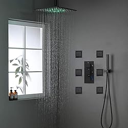 - Colour:Matte Black Thermostatic design,can prevent scalding injuries, in particular to the elderly and children Rainfall shower head Color Changing with Water Temperature,no need battery *0-30°C (32-86℉): Blue LED *30-40°C (86-104℉): Green LED *40-50°C (104-122℉): Red LED *50-100°C (122-212℉): Flashing Red LED What is in the box? RAIN SHOWER HEAD 16" Type: Fixed Rain Shower head Material: Brass Color:Matte Black Feature: Big Enough to Cover Your Body Connection:G1/2" Standards RAIN SHOWER ARM 12" Type: Ceiling Mounted Shower Arm Material:Brass Color:Matte Black finish Feature:12 Inch Long Shower Arm with Flange Straight Connection:1/2" NPT Standards HAND SHOWER HEAD Type: Handheld Showerhead Material: Brass Color:Matte Black finish Connection:G1/2" Standards HAND SHOWER HOLDER Type: Wall Mounted Shower Holder Bracket Material: Brass Color:Matte Black finish Feature: Adjustable Connection:1/2" NPT Standards Shower Mixer Valve Control Features: Three Function Material:Brass & Ceramic valve Color:Matte Black finish Connection:1/2 and 3/4 Standards 6 PCS Body Jet Set Material:Brass Color:Matte black finish Feature:Massage Connection:G 1/2" Standards SHOWER HOSE 59" Type: 59 Inch Stainless Steel Shower Hose Material: Stainless Steel Color:Matte Black finish Feature:Flexible and does not kink,easy to install. Connection:G1/2" Standards Remarks: This full set please let the professional plumbers to install ,thank you !