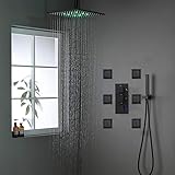 AYIVG Thermostatic Shower System 16 Inch LED Square Rainfall Shower Head With 6 PCS Body Jets Set Bathroom Brass Ceiling Mounted Matte Black Shower Set
