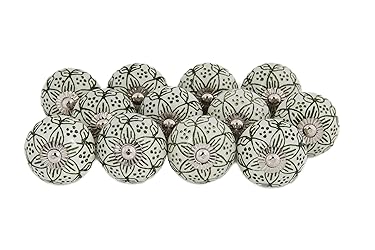 - Mela Artists “Chambal Gardens” Ceramic Knob Set of 12: Our kitchen cupboard knobs will make any furniture look unique and more elegant. The ceramic material of kitchen knobs for cabinets provides a smooth and comfortable grip making it effortless to open and close the cabinet doors, drawers, and more. Each of these cabinet & furniture knobs has a ceramic-finished reversible backplate and a unique and intricate olive embossed Lily print that can enhance the aesthetic appeal of your home or office decor. Experience the beauty of nature at your fingertips with these kitchen cabinet knobs. These cupboard knobs go beyond cabinets and can upgrade the beauty of dressers, cupboards, doors, cabinets, and more. Enjoy the smooth and comfortable grip and easy operation while opening or closing the knobs for kitchen cabinets and drawers. — Cabinets Knobs Details: Print: Embossed Lily Flowers - Cabinet Hardware Knobs Material: Ceramic - Ceramic Drawer Knobs Hardware: 2 small washers, 1 large washer, 2 nuts, 1.5” bolt, and extra 2” screw. --- About Us: All Mela Artisans products support fair trade through an extensive program that preserves Indian craftsmanship and promotes the welfare of communities throughout the country. We are so confident in the quality of our products that we offer a no questions asked, money - back