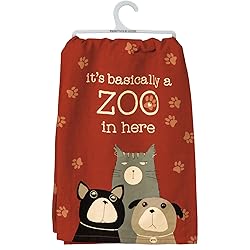 100% COTTON: Features soft 100% cotton material. RUSTIC DESIGNS: Features rustic pet-themed design with distressed details. MACHINE-WASHABLE: Kitchen towel is conveniently machine-washable to use over and over again. SENTIMENT READS: It’s Basically A Zoo In Here DESIGNED IN THE USA: Proudly designed in the USA.