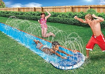High Speed Sliding Action! Sprinkler-lined bumper at the end of the pool adds to splash landing. Slide is 16' long x 28" wide. Comes with water slide and 2 ground stakes.
