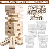- TAKING SHOTS HAS NEVER BEEN THIS EXCITING Instant Classic How great is your dexterity? After a series of shots! The Tower Shot Drinking Game will put that to the test. A fun twist on the tumbling tower game you’ve grown to love, this drinking game for adults features fun drinking challenges on every wooden block. Bring it out during your next house party or adult game night and make that hangout one to remember. Every set includes 48 blocks made using real wood and 4 high-quality shot glasses to cater up to 4 players. How to Play Arrange the blocks according to the instructions, gather the crew, get out the liquor, and let the fun begin! Players take turns removing a block from anywhere in the tower, following the printed drinking challenge, and placing it back on top of the tower. The aim of the game? Don’t let the tower collapse during your turn! Whoever takes the last turn without the tower tumbling is crowned the champ and is declared the drinking heavyweight. Here’s why you’ll love this tower shot drinking game: ✔Comes with 60 blocks and 4 shot glasses✔The blocks feature fade-resistant printed challenges.✔Real glasses and high-quality wooden blocks ensure impressive durability.✔Caters for up to 4 players and enthralls players 21 and up.✔Great addition to house parties and adult game nights.✔Sold in a colorful printed box to make a great gift for adults.Make that hangout all kinds of fun with this unique shot drinking game!