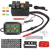 UPGRADED CONTROL SWITCH - Adopting capacitive sensing technology with green indicator light, it high sensitivity, stability and strong anti-interference ability, utilize high quality materials in manufacturing processes results in switch kit that deliver exceptional wear resistance performance. Backlight brightness adjusted automatically by surrounding condition, in bright environment it becomes brighter, and in dark environment it becomes darker to maintain the most comfortable visual brightness. SAFE GUARANTEE - The light pods switch panel with relay, 6pcs fuses and build-in integrated temperature protection system, entire circuit over-voltage protection, over-current protection, overheat protection and reverse polarity protection. Max. Input Circuit: 60A Max. Input Power: 720 Watts. CONSIDERATE DESIGN - The circuit control box included all accessories, there are switch panel mounting brackets and 3M double-sided adhesive tape to install the panel, don’t need to dig hole. 10pcs zip ties help manage the wires better make sure tidy after installation and plug and play connect wiring harness. 50pcs DIY switch panel stickers meet your favor and needs. WIDE APPLICATION - This led light switch panel save more space and can be mounted on more positions like dash panel, dashboard, center console, overhead sunglasses holder, etc., fit for DC 12 Volt Truck, Pickup, Chevy, Off Road, 4x4, Ram, GMC, SUV, power sports, RZR, side by side, Can-am, ATV, UTV, Sand Rail, Dune Buggy, SxS, tractor, marine, boat, golf cart etc.. PRODUCT INCLUDED - All in one design, don't need to buy other parts, package included 6 gang switch + switch control box + switch panel mounting brackets + connect wires + 3M double-sided adhesive + Spare fuses + zip ties + circuit breaker + DIY switch panel stickers + Mounting hardwares+ Use Guide.