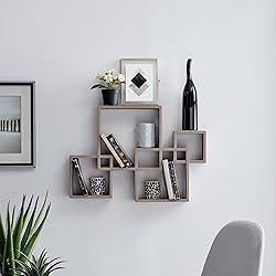 - The Danya B. fun intersecting cubes wall shelf features four intersecting cubbies plus level display space on top of them. Its contemporary finish will add a touch of home décor to your walls as you display your favorite photos, accessories and collectibles. Easy to install with no visible connectors or hanging hardware. You'll love the way this chic, modern shelf looks in your home - and with four intersecting cubbies plus level display space, it has as much function as it does style. It's a breeze to set up, and no visible connectors or hanging hardware will be visible when it's done. Get creative with your wall décor and make your home shine! All hardware included. Choose from four fabulous colors: Black, White, Espresso, or Weathered Oak!
