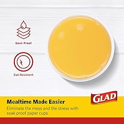 - Glad Soak Proof Everyday cups make mealtime easy. Made from the highest quality materials to prevent liquids from seeping through, these strong, durable, and beautiful paper cup will instantly dress up any dinner, dessert, snack, or meal at your table setting. These paper cups are disposable, making cleanup easy for everyone. You can feel good about the tabletop you use when you dine with Glad. Glad brings you strong and sturdy 12 oz disposable paper cups, making every meal, snack, and beverage even more enjoyable. This 50 count of disposable paper cups is made from high quality materials that prevent leakage and hold strong when used with hot beverages. Great for adults, kids, and toddlers, these disposable paper cups work well for everyone. They feature a pretty purple flower print on a white background, adding a flair to any table setting. Dine better with Glad. Paper cups like these 12 oz paper cups could be coffee cups for iced coffee, disposable cups, disposable coffee cups, or simply paper party cups for soda, juice, or water. These are not dixie cups or small containers with lids, nor are they reusable coffee cups with lids. Some people may see them as cute gifts or football party decorations. These 12 oz paper cups are not 16 oz coffee cups, nor are they paper cups 3 oz. White paper cups are disposable cups that are great for all occasions. Your satisfaction is Our priority: if you have any questions or feedback, please reach out to us at Brand Buzz CP. Glad and logo are registered trademarks of the Glad product company and are used under license by brand buzz LLC. All Rights Reserved. Developed in the USA | responsibly made in China 2020.