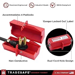 Extremely Versatile - Large plug lockout secures plugs with up to 3-inch diameter, 2 cord holes with 1-inch diameter, locks out up to 2 plugs at the same time, isolates hazardous energy and prevents unauthorized access Industrial Grade - Cord lock out made of rugged non-conductive polypropylene, endures extraordinary amount of force and tampering, built to withstand heavy industrial use Premium Lockout Tagout Kit Device - (1) red plug cover with striking “Danger Locked Out Do Not Remove” label, hexagon body design, 4 LOTO locks holes with 5/16 inch diameter OSHA Compliant - Electrical plug lock out meticulously designed to help businesses meet and exceed compliance with safety standards and requirements. Trusted Safety Supplier - TRADESAFE is an established USA based and owned industry expert and reliable safety partner for lock out tag out compliance supplies