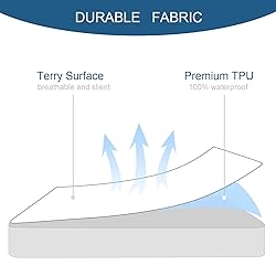 - 100% Waterproof With breathable and waterproof membrane, this mattress protector is more durable to wash, and protects your mattress against fluids, sweat and other accidents, prolongs the life of mattress. Premium Surface Premium's terry surface design is soft, smooth, and noiseless. It is breathable to reduce heat build-up.Soft fabric provides quiet,comfortable and sound sleep. Various Size Twin(39*75), Full (54" x 75"), Queen (60" x 80"), King (78" x 80"), California King (72" x 84")