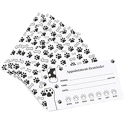 - The Paw Print Appointment Reminder Cards are an essential tool for veterinary clinics and pet grooming businesses. Each set contains 200 cards, measuring 3.5 x 2 inches, crafted from durable 250gsm white offset paper. The elegant paw print design adds a professional touch, making them suitable for any veterinary office environment. As the colder months approach, efficient scheduling becomes crucial to ensure pets receive timely care. These cards are designed to support effective communication and reduce the likelihood of missed appointments. Ideal for use as veterinary appointment reminder cards and pet grooming appointment cards, they provide clear spaces to record the client's name, appointment time, date, and day of the week. This clarity aids pet owners in remembering their next visit, facilitating seamless interactions between professionals and their clients. These cards are utilized by veterinary professionals, dog groomers, and other pet service providers to maintain an organized appointment system. While stamps are not included, the cards are designed for standard mail use, providing a physical reminder for clients. They also serve as versatile veterinary postcards, enhancing the functionality of your office supplies. With robust construction, these cards withstand frequent handling in busy work environments, ensuring long-lasting use. Equip your veterinary office or grooming business with these appointment reminder cards, designed to enhance organizational effectiveness and ensure pets receive the care they require. Whether for veterinary offices or pet grooming services, these appointment cards support efficient scheduling and communication.