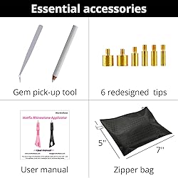 - All-in-one starter kit: includes heat fix setter, 6 redesigned tips, 3400 Pcs glass hot-fix jewels in 3 sizes (3/4/5mm, SS10/16/20), tweezers, support stand, wax gem picker, user manual, all kept in a zipper bag