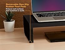 Ideal for a single monitor (up to 30") or a laptop Holds up to 25 lbs. of weight Four adjustable height options: 2 1/8", 3 5/8", 5" and 6 1/2" Built-in cord channel to easily route wires Storage area underneath (14" wide) for small keyboards, notebooks and other accessories Removable, non-slip rubber feet