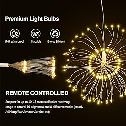 【Remote control and 8 modes】 Control the fireworks remotely with 8 different modes. Combination, In Waves, Sequential, Slo-Glo, Chasing / Flash, Slow Fade, Twinkle / Flash, Steady On 【High brightness and IP65 waterproof】 After a few hours for use, copper wire can be touched safely. Fairy lights use the IP65 waterproof silver wire. Is no welding process and is lightweight and portable 【Wireless remote control】 LED copper wire firework lights 8 modes for choosing, 6 hours on and 18 hours off automatically, it is very convenient to change the different modes and colors depending on the occasions, subject 【Perfect atmosphere】 The perfect accent lighting for indoors, ideal for party and wedding decorations, fairy lights create a warm and opulent ambience, fairy lights provide the perfect mood 【DIY Bouquet Decorative Lights】 The string is flexible and strong enough, it can be easily bend and shaped in any shapes You can choose your favorite shapes such as fireworks, flowers, stars, ect.Ideal for room, garden, terrace, wedding, party, and Christmas other DIY festive decorations