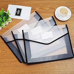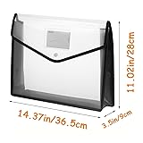☛ WHAT YOU GET --- 7 x Black file folder. 7 x Black gel ink pen. File folder size approx: 14.37 x 11.02 x 3.5inch / 36.5 x 28 x 9cm ( L x W x H ). Each plastic folder can hold about 1000 sheets of paper. ☛ PREMIUM MATERIAL --- Made from super thick polypropylene material, the poly envelopes are durable and recyclable, tear and water resistant, no odor, non-toxic, environmentally friendly, not easy to break and deformation. Ideal for long term storage your important document. ☛ PRACTICAL DESIGN --- The see-through sleek document folder keeps contents visible and makes finding documents so easy without opening your envelopes. Each envelope with a label pocket better help you sort through the various files. Button design for conveniently opening and securing contents, lets you no longer worry about file loss. ☛ LARGE CAPACITY ---Our file folder size is larger than normal A4 paper, it can even hold B4 paper very well. 50c thickness gives you the wider storage area than other folders, so you can put many office supplies and documents in folders. Simple and fashion. ☛ MULTIFUNCTIONAL USE --- Portable to carry it everywhere, such as for school, office, bank, meeting room, home use. Quickly and easily organize your coupons, tickets, magazine, paperwork, photos, documents, bills, receipts, craft projects, small toys, gift wrap, gift cards, crayons, pens, puzzles, etc.