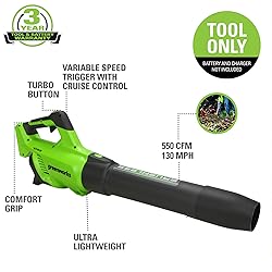 - Introducing the Greenworks 40V Cordless Axial Blower, a powerful and efficient solution for all your outdoor clearing needs. This high-performance leaf blower boasts a robust 550 CFM airflow and an impressive 130 MPH airspeed, delivering 28% more air volume than its predecessor. Experience the convenience of gas-like power without the hassle of cords or fuel, thanks to its advanced brushless motor that ensures greater efficiency and a lower noise level. The Greenworks 40V blower offers up to 34 minutes of runtime on high when powered by a fully charged 4Ah battery (not included), allowing you to tackle all your projects with ease. Enjoy precise control with the variable speed trigger and cruise control, which enable you to adjust the airflow according to your specific requirements. For those moments when maximum power is needed, simply engage the turbo button for an extra boost. With the Greenworks 40V Cordless Axial Blower, you can experience unparalleled performance, convenience, and control in a battery-powered tool. Clear your outdoor spaces effortlessly and enjoy the freedom of cordless technology. Please note that battery and charger are not included.