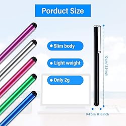 Small size and light weight: the pen-shaped slim touch stylus measures about 10 x 0.4 x 1 cm/ 3.9 x 0.16 x 0.4 inches, and each one weighs approx. 2 g, giving you a real-pen-like touch and a comfortable grip Universal stylus pens: the digital pen can be applied to most touch screen devices, which are compatible with Android smartphone, tablet, car navigation system, etc. No scratch, no fingerprint: the universal stylus pen works more sensitively and accurately than fingers, and will not leave any fingerprints on the screen, thus providing you with a smooth experience; The soft tips of these stylus pens can slide smoothly across the screen and won't scratch your touch screen devices Slim and portable: the capacitive pen is made of lightweight aluminum and quality soft rubber, which is durable and long lasting; The stylus with clip design and small size can be easily put into a pocket or bag for handy use anytime and anywhere Large quantity and assorted color: these capacitive stylus pens come in 10 different bright colors, 10 pieces per color and 100 pieces in total, durable quality makes them nice gifts for family, colleagues, friends, office, etc., sufficient quantity and colors to meet your different needs