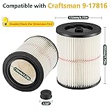 NOTE: Please Searching and Check your specific model first in the description then order. 9-17816 Filter is 𝐂ompatible with 𝐂raftsman 𝐖et 𝐃ry 𝐕acs 𝟓 gallons and larger, as well as, 𝟔 gallons vacs made since 𝟏𝟗𝟗𝟐 and 𝟖, 𝟏𝟐, 𝟏𝟔, 𝟑𝟐 gallons vacuums produced since 𝟏𝟗𝟖𝟖. If you receive our 9-17816 filter with any problem of compatibility, Please contact us first and we will help you 【COMPATIBILE MODELS】- High Quality 9-17816 Red Stripe Shop Vacuum Cartridge Replacement Filter Wet/Dry Cartridge Filter Compatible with Craftsman 17816 9-17816 Vacuum Cleaner, fit Most 5 Gallon and Larger Vacs. (Searching your specific model in the description) 【PREMIUM FILTER】 - 9-17816 filter replacement for Shop Vac Craftsman 17816 9-17816 Vacuum Cleaner with heap filter use to pick up dry debris, pleated paper filter for better filtering of debris,works with threaded non-threaded filter cage studs to keep your home clean and comfortable 【WET and DRY USE】 - Our 9-17816 replacement filter made with high quality washable materials to ensure durability. Detachable top plastic cap to ensure fit for most 5, 6, 9, 12, and 16 gallon and larger vacuums made after 1988, Works with many Vacuums as well. Replace every 3 months for optimal performance 【HIGH PERFORMANCE FILTER】- Package include 2 x Cartridge Filter, 2 x integrated cap fits for Craftsman 17816 9-17816 Shop Vacuum Cleaner, meet you needs to replace the filter to keep machine fresh and clean,durable and long lasting replacements. Diameter of filter: 8.5 H x 6.5 W inch; integrated Cap:1.6 inch 【AFTER SALES SERVICE】- We are focus on providing the better quality of the replacement filter, Providing full money-back guarantee for problems of size, fit, and quality. If you have any quality and dimensions problem with our 9-17816 Replacement Filter for Craftsman Shop Vacuum Cleaner, please feel free to contact us and we will reply ASAP in 24 hour.Filter made of FSC-Certified paper