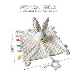 - Baby Tags Security Blanket with Stuffed Animal is a perfect friend accompanies your baby in bedtime. They calm baby with snuggle, chew, nuzzles and cuddles, makes them feel entertained and relaxed. No boring or lonely long dark night any more ! FEATURES: 1.Our colorful textured tags blanket is lightweight and easy to carry around. 2.Soft and comfortable Appease Towel, great for your baby to cuddle while sleeping. 3.This adorable security blanket makes your baby’s bed look stylish and exquisite. 4.Satin loop tags on the side help to train baby’s grip strength. 5.It can be used as a security blanket, durable bib and funny soothing toy. 6.Easy care, machine washable in mesh laundry bag on gentle cycle CHARACTERISTICS: MATERIAL: Soft plush and pp cotton ITEM SIZE: 11×11’’ (inch) ITEM WEIGHT: 90g Shape & Color optional: Pink / White Bunny Tags Blanket; Pink / Grey Rat Tags Blanket ; Grey Elephant Tags Blanket ; Yellow Unicorn Tags Blanket CONTENTS: 1x cozy security blanket 100% SATISFACTION PROMISED from US! Any problem will be given a fine solution. Any suggestions or idea would be respected and welcomed