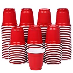 - Zcaukya Mini Disposable Red Cups Material: Plastic Color: red Capacity per cup: 2 oz Dimension: Top diameter: 2"; Bottom diameter: 1.2"; Height: 2" Perfect For: all kinds of party drinking games - graduation parties, birthday party, buddy party and more. Besides, the mini cups can also be served as assorted cups, portion cups, jelly cups, sample cups, etc.