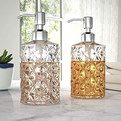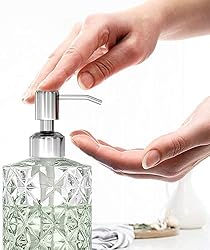- Elegant and timeless Diamond cut surface design Clear Glass Soap Dispenser. This soap dispenser blends vintage with modern complements your home, kitchen, and bath decor.Key Features: Beautiful and Elegant Diamond Design, made of high quality glass, natural and safe. Durable Dispenser Pump. Anti-fingerprint, premium material construction. Made Of Premium 304 Stainless Steel Which Can Remain Long Lasting Bright And Prevent Corrosion Or Rust. The bottom has the anti-skid thread, uniform, and strong appearance. Suitable for hand soap, dish soap, shampoo, body cleanser or lotion, etc.Specification: Type: Soap Dispenser Material: Glass Color: Crystal Clear Size: 3.2 IN (W) X 7 IN (H) Capacity: 12OZUSING TIPS: Recommended To Rinse With Water Or With Neutral Wash Products And Wipe With Cloth.Package Includes: Value 2 Pack Glass Soap Dispensers