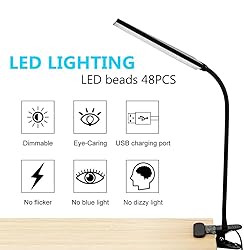 - Features: Dimmable Desk Lamp: With the 48 energy-efficient LED beads, the clamp light offers 14 level brightness and 3 color temperatures to meet different needs of light. Eye-caring: This clip on light emits flicker-free and non-glare light, helping avoid eye fatigue, ideal for reading, working, studying. Flexible Neck Design: The neck can be 360° rotation in all directions for use. Clip light with metal clamp: easily clip on anywhere you want, such as bed headboard, desk. Specifications: Light Source: LED Source Item Weight: 273g Package Weight: 405g Package Dimensions: 31x11.5x7.7cm(12.20"x4.53"x3.03") Voltage: 5V/1A Power: 5W Color Temperatures: 2700-6000K Lifespan: 30000 hours Luminous Flux: 320lumens Package 1* LED Desk Lamp 1* Manual