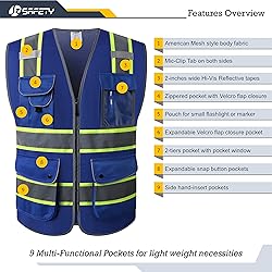 100% Polyester Imported MATERIALS: 100% Polyester Mesh Lite Lining Hi-Vis Reflective Body Material, Lightweight, Breathable, Durable, and Machine Washable. Customers who prefer a Loose Fit may order the next 1-2 sizes up. Please check the size chart before placing the order! HIGH VISIBILITY AND 360¡ã REFLECTIVITY: Blue safety vest is highly visible with Four 2-inches wide Yellow color trims reflective strips covering the chest, the waist, and the back, she can reflect 360 degrees Retro-Reflective light wave under daylight or low light conditions. 9 MULTI-FUNCTION POCKETS DESIGNED: The vest comes with 9 Front Pockets | 2-Tier PVC Transparency ID Badge Pocket | A set of Zipper and Velcro Flap closure pockets and a hidden D-Ring | 2 Expandable Utility Pockets with side hand-insert pockets. Sizable storage space for cell phone, small flashlight, and other daily lightweight items. APPLICATIONS: Great for municipal workers, construction and renovation workers, contractors, site engineers, superintendents, surveyor, foresters and conservation workers, FAA airport ground crews, fulfillment center/warehouse workers, public safety marshal, crossing guard, traffic and parking attendants, securities, transportation and truck drivers, survey crews, and volunteers. Or for recreational activities such as cycling, wilderness hiking, park walking, jogging, and motorcycling. CERTIFICATIONS: Full compliance with ANSI/ISEA 107 Class 1. Any manufacturing defect is eligible for Exchange or Refund
