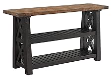 - The Bolton Sofa Table offers an Industrial Rustic style to your living or family room. The table is constructed of solid New Zealand Pine and finished in a two-tone Black Stain base and Natural top. The industrial style is represented with four large dark aged brass finished industrial bolts that span across each end the top. The x-framed legs not only add to the look, but provide extra stability. The 1.5” thick tops are detailed with a plank design purposeful distress marked details. Two shelves allow for plenty of storage space. The 55” wide design allows for the table to also be used as a TV Stand or Console for TVs up to 60” W. Assembled product dimensions: 55" W x 16" D x 30" H. Product materials: New Zealand Pine, Metal. Easy to assemble. Made in Vietnam.