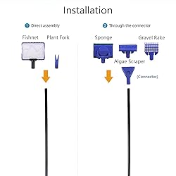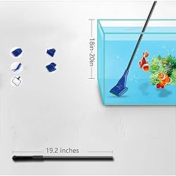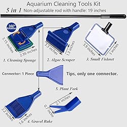 - JZMYXA 5 in 1 Multi-Function Aquarium/Fish Tank Cleaning Tools ( Fixed Length Rod)5 in 1 Function, fixed length rod. The length (Rod+handle) 19 inches. Total length (algae scrape+rod+handle) 21 inches. Algae scrape made of 430 steel, have certain anti-rust ability, but it should be cleaned after use. Other accessories made of ABS plastic.Package:1 Algae scrape 1 Cleaning Sponge 1 Piece 3.9" small fishnet 1 Gravel rake 1 Plant Fork 1 Connector 1 Piece 19" rod with handle.