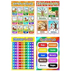 - Educational Spanish poster Spanish toddler learning poster for preschool to elementary kid and homeschool kindergarten Spanish class decorations with glue point dot All posters printed with Spanish: Alphabet, numbers 1 - 100, days of the week, months, seasons, colors, farm animals and shapes. br> Useful gift for Spanish learner: These delightful colors education Spanish posters are helpful for home schooling, pre-K, preschool, nursery home and kindergarten, and these posters will make children smile in any situation. Quality material: All Spanish learning poster are made with 250 gsm cardstock, and double sides are covered with quality PET film, tear resistant, waterproof, writable and safe for your kids. Easy to use: We do not roll our posters in tubes, come completely flat upon arrival, easy to place on the wall with glue point dot. Vivid colors and pictures: Each Spanish learning poster are 17 x 12 inches, and eye-catching designs make it easier to see and features colorful pictures, bright colors, and designs, helping kids stay focused while they're learning. Specifications: Poster dimensions: 17 x 12 inches Quantity: 8 pieces Package contains: 8 x Educational preschool posters 60 x Glue point dots