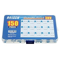 - BOJACK 150pcs High Quality High Voltage DIP Ceramic Capacitor Assortment Kit Specifications: Capacitance Model: 100pF ~ 10nF (100pF, 150pF, 220pF, 330pF, 470pF, 560pF, 680pF, 820pF, 1nF, 1.5nF, 2.2nF, 3.3nF, 4.7nF, 6.8nF, 10nF) Rated Voltage:3 KV Main Material : Ceramic Color: Blue Features: Coated with epoxy resin. It has the advantages of high working voltage, large specific capacity, good moisture resistance, low dielectric loss, and the capacitance temperature coefficient can be selected in a wide range. Package Included: 100pF - 10 Pcs 150pF - 10 Pcs 220pF - 10 Pcs 330pF - 10 Pcs 470pF - 10 Pcs 560pF - 10 Pcs 680pF - 10 Pcs 820pF - 10 Pcs 1 nF - 10 Pcs 1.5nF - 10 Pcs 2.2nF - 10 Pcs 3.3nF - 10 Pcs 4.7nF - 10 Pcs 6.8nF - 10 Pcs 10nF - 10 Pcs Package Quantity: 150 pcs The packaging is grouped by size and placed in a durable resealable plastic storage box for ease of use.