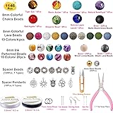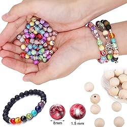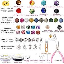 - EuTengHao 1146Pcs Lava Beads Round Loose Marble Beads in Ink Patterns Chakra Beads Open Jump Ring Spacer Beads Bracelet String for Adult DIY Crafts Xmas Gift Pendants BraceletNecklace Jewelry Making Supplies -Jewelry Beads:Size: 8mmMaterial: Natural stone and glassColor: Multicolor Packing Includes:120 pieces * 8mm black lave beads200 pieces * 8mm ink patterned beads (10colors) 25 pieces * wooden beads25 pieces * black frosted beads42 pieces * 8mm chakra beads (7 colors)40 pieces * colorful lava beads110 pieces * spacer beads (6 styles) 10 pieces * different shape pendants-Jewelry Findings:100 x 7mm open jump rings (silver)100x eye pins (silver)100 x crimp beads (silver)100 x crimp beads (gold)100 x head pins (silver)50 x earring hooks (silver)20 x bail beads -Jewelry Tools:2 pieces * crystal strings1 pair * pliers1 piece * thread scissorThis jewelry beads set for adults to make personalized bracelets,necklaces, etc. They can improve their imagination and hands-on ability, and get their own personalized products. High quality products, beautifully printed and evenly sized.