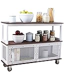 Break out this rustic looking rolling kitchen cart at your next event of family or guests. 3 tiers built into this catering cart means you have room to maximize plating space for easy service. Adorned with decorative metal accents, this rolling serving cart has appeal in surplus and the colors complement each other flawlessly. The cabinet-style doors at the bottom keep dishes secure. Rolling wheels on the bottom of this catering allow you to move it with ease around the serving area or where the guests may concentrated. Roll out a fancy meal for your family in the mornings. Keep this rolling kitchen cart for your own home or catering business when you're entertaining. It also makes for a great gift to the entrepreneur friends you may have who work in catering. MDF and metal. Assembly required; assembly hardware included. 40"W x 12"D x 29-1/4"H. Industrial Rolling Buffet Serving Cart - Kitchen or Bar
