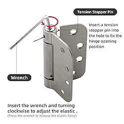Package Includes: 16 pcs #10x1" flat head cross self-tapping screws, 16 pcs #10x1/2 flat head cross self-tapping screws, 1 M4 adjustment rod, 4 stop screws Adjustable Tension and Self Closing: The hinge uses a spring-loaded mechanism with an automatic closing function. Using the included adjustment tool, you can increase or decrease the spring tension to control whether the door is slightly open or completely closed Premium Material: Adjustable spring door hinges are made of steel, satin nickel finish, making them sturdy and durable for long-term use Wide Applications: Spring door hinges have a variety of applications and are suitable for residential buildings, hotels, offices, hospitals, schools, dormitories, companies, stores, classrooms, libraries, gyms, cottages, and other settings Notice: When the door weight is less than 85LBS, 2 hinges can be used forinstallation; when the door weight is between 85-100LBS, 3 hinges are requiredfor installation