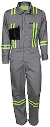 Cotton Imported Summit Breeze vented design keeps the wearer cooler, decreasing the chances of heat stress while also redirecting a majority of the off gas away from the breathing zone during a flash fire or arc flash event ASTM F1506 Electric Arc Protection, ATPV 8.7 cal/cm2, CAT2, NFPA 2112 UL Certified, NFPA 70E, ASTM 1930 Tested, Certified Made of a 7-ounce 100% cotton material with triple needle stitching on high wear areas for durability, 3-inch flame-resistant yellow/silver/yellow reflective stripes on arms and legs and 2-way flame-resistant zipper front Elastic waist back for movement and fit, adjustable two snap closure on each sleeve cuff and adjustable snap ankle closure Dual left and right front hip pockets, each with pass through pocket, two roomy back hip pockets, pencil pocket on left sleeve, 2 chest flap pockets with snap closure and mesh gas monitor pocket on right chest