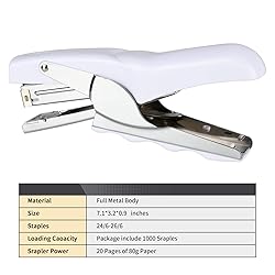 - COCOMK Heavy Duty Plier Stapler: Comfy Grip:Feels good in the hand. Grap the end to staple. Ergonomic Design for not hurting hands while stapling. Labor Saving:Save 60% Effort than using normal staplers. You don’t have to use much force at all to push it down to staple your papers. Specification: Staple Type: 24/6, 26/6 Item dimension: 172*74*36 mm Weight: 80 g Capacity: 20 sheets Material: Plastic + Metal COMMODITIES INCLUDE:1*Stapler + 1000 Staple