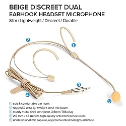 PREMIUM HEADSET MICROPHONE - Slim Dual Earhook Face Mic Provides Dependable, Professional Sound Quality; Comfortable & Durable, Perfect for All Kinds of Live Performances & Productions. CRYSTAL-CLEAR VOICE & SOUND - Powerful, High Sensitivity Headworn Earset Microphone Amplifies Your Voice, Stable Signal, Zero Delay & Crisp, Vibrant Audio Transmission for Indoor & Outdoor Activities. WIDELY COMPATIBILITY- 3.5mm (1/8") Standard Plug Connector Compatible with Wireless Transmitter PC, Voice Amplifier etc. SLIM, LOW-PROFILE BUILD - Small, Lightweight Styling, Slightly Adjustable Arm Boom, Unidirectional Design & High Quality Windscreen Offer Comfort & Convenience for Studio & Stage. WIDELY AUDIO APPLICATIONS - This Ergonomic, Lightweight and Flexible Design Mic is Perfect for Church & Temple, Live Theater, University Professors, Guest Speakers, Video & Podcast Productions, Stage & Vocal Performances, Fitness Instructors, Tour Guides & More!