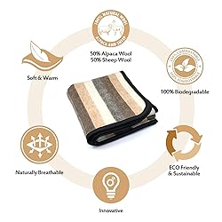 Cozy, Breathable Warmth: With a thick, tight weave, our alpaca blankets block out the cold and wrap you in a cocoon of comfort! Luxuriously soft and incredibly breathable, you can snuggle up to lasting warmth without itch, irritation or overheating Designed for Versatility: From blanket forts to family movie night, our alpaca throw is a must-have any time of the year! Perfect for picnics, camping and sporting events, you can take it on the go for portable comfort that truly knows no bounds Rustic Sophistication: With gorgeous earth tones and a bold stripe pattern, these alpaca wool blankets add a simple elegance to any home! Measurements are 103" x 90" (king size) Premium Fiber Blend: Made in Peru, our wool throw blankets are an ideal fiber blend of 50% sheep wool and 50% alpaca wool! Offering strength, durability and a smooth texture, be sure to dry clean only to maintain quality and softness. Easy to care: Just handwash your alpaca sheep wool blanket with warm water and a soft soap, hang it to let it dry and you are ready to use it again!