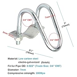 Material: Carbon Steel, Surface Electrogalvanized. Anti-corrosion and anti-rust U-shaped buckle fits 3/4" EMT (OD 0.922"), also fits 1" Round Tube, clamps diameter thickness: 7mm Crossover Clamps Purlin brackets, easy installation, coupling two pipes at 90 dregee angles to each other Application: Pipe To Pipe Lock Clamp Holder, suitable for greenhouse awning frame cross-connectors,agricultural fixtures