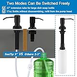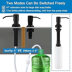 No more logo on the top of soap dispensers, since 2020. BUILT TO LAST: kitchen sink soap dispenser black pump head is made with exterior commercial grade 304 stainless steel (acid-resistant and corrosion-resistan,excellent strength and hardness makes it longevity)and interior durable PE plastic(high plasticity, high precision). Extended 3'' nozzle to (full 360 degrees rotates) prevent splashing of soap. Aerodynamic principle make the pump is easy to push that could better to control the amount of the soap.Easy-press and doesn't jam for pressing,and passes over 50,000 pressing test. TWO INSTALLATION METHODS: Are you tired of seeing the big bottle of soap on the counter at all times? Here are two ways to save your trouble! First is the large capacity--17 oz bottle. large volume soap bottle can reduce of adding times, saving your time.The second is with 47" under sink soap dispenser extension tube kit, use the big dish soap bottle directly, no need to refill small canisters anymore.You could choose what you want. LONGER THREAD and SPOUT: Our matte black soap dispenser pump has lengthen 3” nozzle (can swivel 360°) avoid the soap splash. Its Lengthen(5'') and thicken threaded fits most countertops (Granite, Stainless Steel, Wood), durable and not easy to fall and break. Larger and thicken bottle mouth to prevent the bottle falls off. The pump is tightly connected to a short tube, no leak and drip.With rubber washers on both sides, u don't have to worry about countertop water leaking through. HIGH QUALITY DISH SOAP DISPENSER EXTENSION TUBE KIT: The in sink soap dispenser tube is made of corrosion resistance food-grade silicone, the long soap dispenser hose(80°hardness makes good suction and not easy jam) attachment can be extended 47"under the counter. A check valve and Anti-leak accessories keep soap primed at the top of the tube for soap dispenser bottle for a longer time.Comes with 2 multi-sized caps fits most soap container bottle opening from ⌀14mm to ⌀31mm. MULTI-PURPOSE USE - Our Black Soap Dispenser can be used in a variety of ways fill it up and use it as a hand soap dispenser, liquid soap dispenser or even for lotion (Warm reminder that If the liquid is too thick, it needs to be diluted for better effect.). Makes it one the must have kitchen sink accessories a real space saver. EASY TO REFILL FROM THE TOP: Without disassembling, refill soap from the in sink soap dispenser pump head. Lengthen and thicken 5'' threaded tube fits most countertops(Granite, Stainless Steel, Wood). With rubber washers on both sides u don't have to worry about countertop water leaking through. U can also use it in bathroom, laundry or RV sink soap dispenser. MODERN DESIGN & EASY INSTALLATION: Modern design make your kitchen elegant and suitable for most sink. No need too many bottles on the countertop.SonTiy countertop soap dispensers comes with EASY to follow step by step instructions, no require plumber,finish DIY installation only takes you a few minutes, works as a faucet soap dispenser.