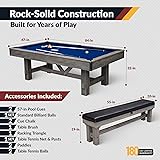 3 IN 1 POOL TABLE – Have a multifunctional 7ft pool table that transforms from a billiards setup to a table tennis surface or dining table, all with a warm, farmhouse-inspired design that adds charm to any room. SOLID CONSTRUCTION, BUILT TO LAST – Crafted from durable engineered wood with cross trusses and a post-leg support system, this billiards pool table dining table combo is designed to handle years of intense play and family fun. TOURNAMENT-STYLE PLAYFIELD – The Logan dining, ping pong, and billiards table combo features blended wool and nylon blue felt, K-66 gum rubber cushions for precision bounce, and antique bronze inlaid sights for perfect shot alignment. MATCHING BENCHES WITH STORAGE – Two rustic-style benches provide soft padded seating to match the 7 ft pool table 3 in 1. Each bench lifts open to store all your game accessories neatly and conveniently. COMPLETE GAME KIT AND WARRANTY – Includes pool cues, billiard balls, chalk, triangle, brush, net, paddles, and ping pong balls—everything you need for both games. Backed by a 180-day limited warranty for peace of mind.