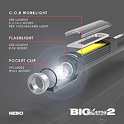 POWER IN YOUR POCKET: Whether you're fixing a leak or working under the hood, the Big Larry 2 easily illuminates any workspace. This magnetic flashlight and portable COB work light is compact and multi-functional, so you can focus on getting the job done. 4 DIMMABLE LIGHT MODES: This LED flashlight emits 200 lumens on High, with a built-in COB Work Light for 500 lm of wide-area illumination; use the COB Red Task Light (40 lm) for night work or the Red Hazard Flasher for 40 hours of emergency signaling. COMPACT & CAPABLE: With a powerful magnetic base and pocket clip/hanging hole, this EDC flashlight easily mounts to metal surfaces for improved visibility in tight spaces; water and impact-resistant, the Big Larry 2 makes light work of tough tasks. BATTERY POWERED & EASY TO USE: This portable work light has Power Memory Recall to remember your last light mode and Direct-to-Red functionality to preserve night vision; conveniently powered by 3 AA alkaline batteries (included). TECH SPECS: Size: 7.75 x 0.98 x 1.25 inches; Weight: 0.45 lbs; Includes: 3x AA Alkaline Batteries; Lumens: COB Area Light: 40 lm (Red Task Light) – 500 lm (Work Light); Flashlight: 200 lm. Note: higher lumens equal brighter lights.