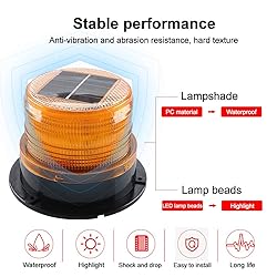 - Specifications: Base Type: Wireless solar LED strobe light Size: 3.75(L) X 5.02(W)in material:PC+ABS LED Quantity:12 Light Color: Amber Flashing Mode:Burst flash(Always flashing) Features: Wireless solar LED strobe light.Solar powered, No need wire and replace the battery 12PCS High brighteness LEDs, irradiation distance 500M With 5.5V 90MA high-efficiency polysilicon solar panel, high-power fast charging. Charging time about 8-10 hours.Can be used for about 50 hours when fully charged Easy on/off power.Turned on/off by pressing the switch Durable PC Lens,Waterproof and Dust Design to withstand harsh weather conditions Powerful Magnets Base.Easy installation or remove from any vehicle metal exterior roof It is great for emergency vehicles, constructions sites , postal service, snowplow, trucks, forklift, tractor, golf carts, utv, etc. **Hope you have happy online shopping experience.**