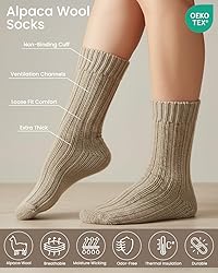SUPREME WARMTH: These extraordinary alpaca socks are the perfect blend of nature's finest fibers, featuring 40% Alpaca Wool, 45% Merino Wool, 12% Polyamide and 3% Elastane for a sock experience like no other. Alpaca wool is renowned for its natural insulation properties, while merino wool adds an extra layer of coziness, ensuring your feet stay toasty even in the coldest of conditions. PREMIUM COMFORT: Prepare to be enveloped in a cloud of softness every time you slip your feet into our alpaca wool socks. The blend of premium wools feels incredibly gentle against your skin, making these socks a joy to wear all day long. It can be considered as a perfect Christmas gift. EXTRA THICK DESIGN: Our alpaca wool socks are extra thick, providing superior cushioning and comfort. Say goodbye to cold feet and hello to lasting warmth and coziness. INDOOR COMFORT: Designed with indoor use in mind, these socks are your ideal companions for lounging, working from home, or just relaxing on a chilly evening. They'll keep you comfortable without causing you to overheat. ANTI-HOLE GUARANTEE: Your satisfaction is our priority. If you experience any issues with our products, please contact us – our support team is always here to help. If the socks you receive have holes, we will promptly send you a brand-new pair.