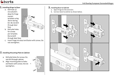 PACKAGE CONTENT: 4 Pieces Soft Close Full Overlay Hinges and Installation Screws MAIN SPECIFICATIONS: Overlay: Full, Opening Angle: 110 Degree, Closing Type: Soft Closing, Adjustment: 3-Cam Vertical, Horizontal and Depth adjustment. These are the main specifications of our hinges, please look at the descriptions section at the bottom for a comprehensive view of all specifications. FULL OVERLAY DESIGN: These hinges will have a straight arm and it allows your cupboard door edge to be completely in line with the edge of your cabinet. One major advantage of a full overlay concealed hinge is that it is fully adjustable due to three little screws that they have. Depth, Side and Height adjustments are made with these three screws. They can be fine-tuned to ensure the door frame is totally concealed and fits together perfectly. SOFT CLOSING: The soft closing function is one of the best indicators of the quality of the hinges. The soft closing feature prevents all disturbing noises from the kitchen and extends the lifetime of the doors, cabinets, and hinges. CLIP-ON FUNCTION: The clip-on hinge is the easiest and quickest to fit, without any tools. It is ideal for doors requiring multiple hinges to be fitted this is because you simply line the hinge up with the mounting plate and push it on in one simple movement, it will then clip on to be connected to your mounting plate. They require very little alignment and make the job much easier when you have a few hinges to fit.