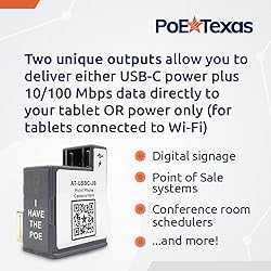 Delivers 22 watts of continuous USB-C power and 10/100 Fast Ethernet Data on one cable to your USB-C compatible devices. Two outputs offer greater flexibility & customization for your set up. Ideal for use as digital signage, Point of Sale, conference room schedulers, and more. Extends power to compatible devices up to 328 feet away from the source. Wired 10/100 Mbps data through the connector allows for greater network security. With 2.0 USB Data Standard Output (95mb/second). This in-wall device fits inside the standard US and European Junction Box for mounted tablet enclosures. Hassle-free plug-and-play design makes installation easy. Compatible with Vidabox, Heckler, Smart-Things, Viveroo, ArmorActive, Compulock, and more. Compatible with Apple Pro, Air, & Mini Tablets, Google Pixel, Surface Go, Surface Pro, Samsung Tab A, Samsung Tab S, Samsung Galaxy, Amazon Fire, and more. Kitted with a USB-C to USB-C cable. Important: NOT compatible with Amazon Echo Hub due to its unique power delivery profile requirements. Backed by a generous 1-year warranty. Expert technical support from Austin, Texas available. Please call 512 479 0317. PoE Texas has a full line of PoE switches and injectors compatible with your application. This product is protected under U.S. Patent No. 11,627,004.