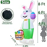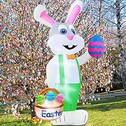 8 Feet Giant Bunny Easter Decoration: A cute pink bunny rabbit wearing green rompers holds colorful Easter eggs basket. Bring your friends family a funny festive Easter LED Lights & Bright Colors: With internal super bright LED bulbs, the colored inflatable bunny lights up for eye-catching nighttime viewing. Lit up your lawn or garden and attract neighbors and guests More Stable & Secure: Includes 2 sandbags, 8 ground stakes and 5 tethers for quick easy setup. A pocket built inside the inflatables for adding sand bags to make it more stable on the ground. The sandbags require to be filled with sand or stone before use Powerful Built-in Fan: With an upgraded built-in blower. Just plug this inflatables in, it will self inflates in seconds. Deflates fast for easy storage. Reusable, store it for next year Easter Decoration Outdoor: Durable nylon fabric for outdoor use. Lighted for Easter Yard outdoor Decoration,Easter eggs hunt events, party decor, lawn, garden, home, office, school and more