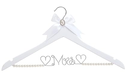 - This is a high-quality personalized bridal clothes hangers, pure white hangers tie-in white bow and pure handmade wire bride, both sides with a heart-shaped, and your wedding dress collocation are together, it will be the best gift to a wedding and party, successfully attracted attention and leave the best for your wedding. The hanger is made of solid wood with a pure white smooth finish to avoid damaging your wedding dress. The U-shaped groove on the hanger is designed to hold the weight of your dress and prevent it from falling off. A 360-degree swivel hook gives your wedding dress its best display. If you are not satisfied with the product after you receive it, please contact us. We will provide you with a full refund or replacement.
