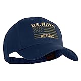 - Title, US Navy Retired Flag Embroidered Solid Cotton Twill Low Profile Strap Cap Symbol of Service, Perfect for everyday wear, Navy reunions, or patriotic occasions that honor a retired U.S. Navy service member One Size Fit, Fits most up to XL size with hook and loop adjustable strap closure Crown Design, 6-panel structured crown, 3.5 inches deep, low profile Bill Features, Pre-curved bill measures 2.75 inches, same color underneath Material Composition, Made of 100% cotton Cap Dimensions, 8(W) x 10.75(L) x 4.5(H) inches Material Feel, Thick, soft, and lightweight Gender & Age, Adult/Unisex Seasonal Use, All seasons Care Instructions, Hand wash only Origin, Imported