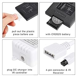 2-in-1 RGB controller Box: The controller has two 4-pin connectors, which can connect 2pcs 12V-24V RGB LED strips at the same time Specification: The IR remote controller Input: DC 12-24V; Current: 6A Max, 2A each color. With CR2025 VO battery. Safety controller: CE & RoHs &Fcc certification. Function: 8 Light Pattern: Quick / Slow / Auto / Flash / 7 color fade change / 3 color fade change / 7 color jumpy change / 3 color jumpy change R /G / B increase and decrease control/ 6 DIY buttons adjust colors freely. The package contains a safe RGB Controller(2 ports) and a 44keys IR Remote; we also provide 12 months of hassle-free protection. Any concern, welcome to contact our 24h Customer Service.