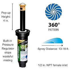 Approved for sale/meets pressure regulation legislation requirements in: CA, CO, HI, VT, MA, ME, NY, OR, RI, WA, and Washington DC Eliminates water loss from misting and over-spraying for up to 75% water savings Built-in regulator maintains constant 30 psi water pressure for maximum watering efficiency Provides optimal nozzle performance and water distribution even in windy conditions Hand adjustable, pro-grade sprinkler sprays multiple rotating streams of large water droplets in a 360° pattern Provides ultra-uniform, wind resistant coverage from sprinkler head to edge of pattern Replace existing pop-up sprays or use in the same zone; perfect for low water pressure or compacted soils No Tools Required - Adjust 13' to 18' spray distance and remove clogs by hand while water is running Flush out debris or a potential clog by simply pulling up on nozzle during operation Tapered stem and flushing action clear debris to ensure stem pops-down after watering