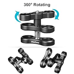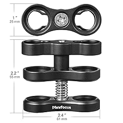 - MINIFOCUS 1 inch /2.54 cm ball clamp for underwater light system features: As a bridge to connect underwater tray/handle to underwater strobe/video light. Easy to assemble and disassemble, meeting various indoor/outdoor/underwater shooting needs, waterproof & rustproof.This ball clamp is made with high quality aluminum alloy, very solid without deformation, durable and practical, waterproof and rustproof.A hard-anodized aluminum wing nut allows for easy one-handed operation and will withstand years of use.This ball slamp underwater attaches two 1" diameter balls. Thicker plates provide the perfect combination of strength and range of motion.Plates are spring-loaded for easy assembly and breakdown of your arm system.Specifications:1.Self powerful combination, CNC aluminum, feel good, hand-held self-timer or connect a fixed bearing 360 degree rotation, versatile, practical, powerful.2.Aluminum CNC diving lights ball clip mount butterfly-type clamp mount accessory kit for underwater photography arms tray system.3.By attaching this mount to underwater photography arms tray systemt you can more easily manipulate your underwater camera and effortlessly take some magnificent photos and videos.4.Made of lightweight aluminum alloy material, weight: 95 g each.5.It can rotate 360°, versatile, practical, powerful.6.Works with 1" ball arms for CamDive, Meikon, Ikelite, TLC, Ultralight, Nauticam, Gopro, DJI Action Camera, Xiaomi, SJ CAM, RAM Ball Mount etc.Material: Aluminum alloyColor: BlackRotation: 360°Net Weight: 9.6 oz/272 gBall size: 1 inch/25 mm.Package List:4x Dual Ball Clamp MountNOTE: Please kindly remember to clean this stick with fresh water and dry it after every time used in salt water.